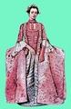 Это платье из дамасского шелка представляет самый популярный стиль той эпохи; "распашное платье". Лиф соединен с юбкой, распахнутой спереди так, что обнаруживается нижняя юбка. Хотя название "нижняя юбка", вообще говоря, ассоциируется с интимной частью туалета, в данном случае она представляла собой часть платья и всегда открывалась для всеобщего обозрения. Облегающий лиф, слегка укрепленный китовым усом, кончался чуть ниже естественной талии. Лиф также был открыт спереди; неширокая кайма шла по линии ворота, через плечи и по обе стороны разреза до линии талии. Разрез лифа заполнялся декоративной вставкой с мысом, богато расшитой летами и кружевом. Вставка обычно прикалывалась к лифу булавками, которые скрывала кайма. Платье надевалось на обруч, уплощенный спереди и сзади. Рукава, кончавшиеся как раз под локтями, были узкими и прямыми, с небольшими манжетами-"крылышками", из-под которых выступали оборки рукавов рубашки. Нижняя юбка, собранная на пояс, завязывалась сзади и опускалась до самого пола свободными складками. Юбка простегивалась, что одновременно придавало ей форму и делало теплой. Костюм дополняли длинные, до локтя, перчатки. Головной убор дамы "наколка" - надетый на макушку чепчик, обшитый кружевом. "Поля" чепчика подворачивались кверху и прикалывались к тулье брошью или драгоценным аграфом.